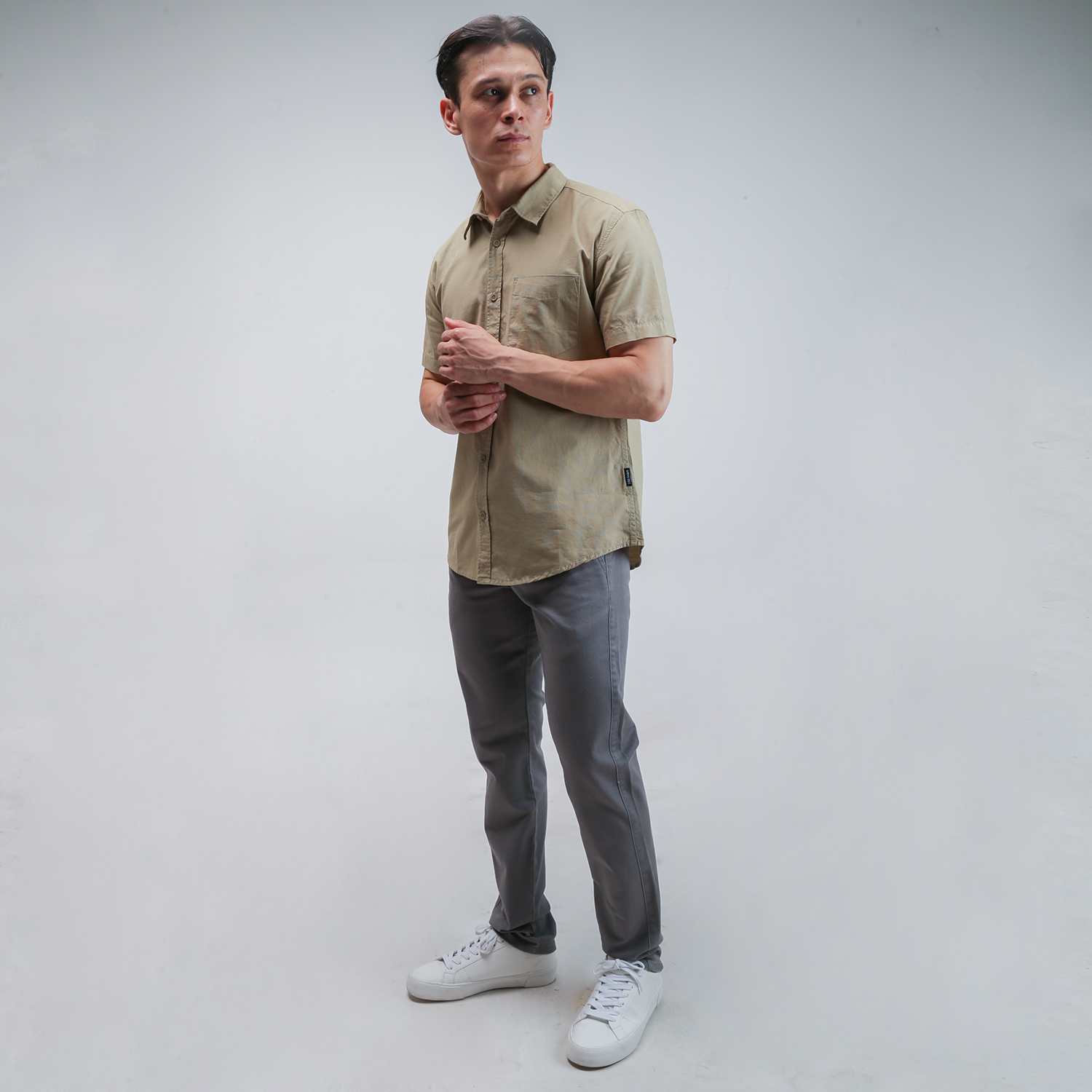 Bahan : 100% COTTON ; Warna : BEIGE GRAY ; Fitting : REGULAR ; Tipe Kain : RIGID (Tidak Melar)