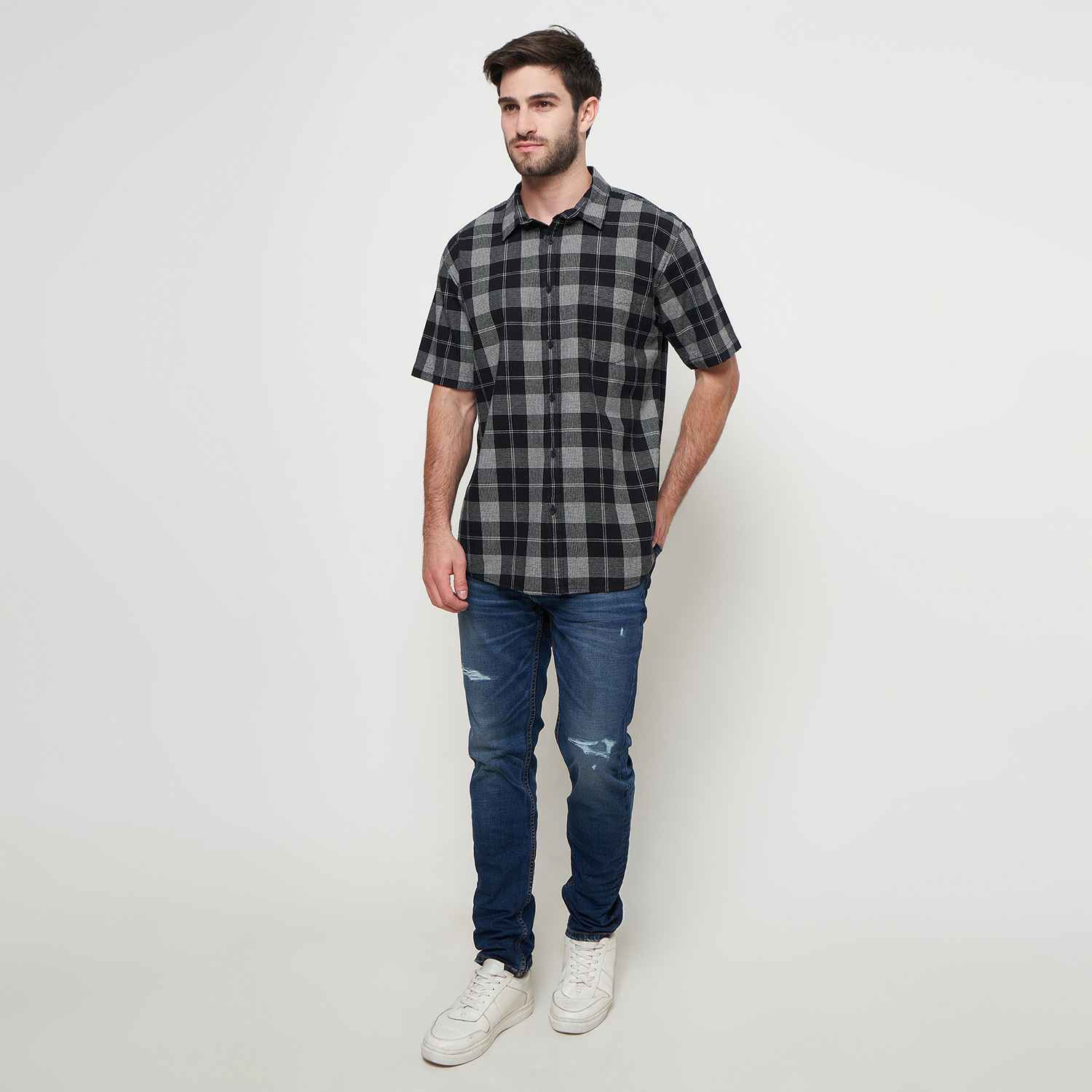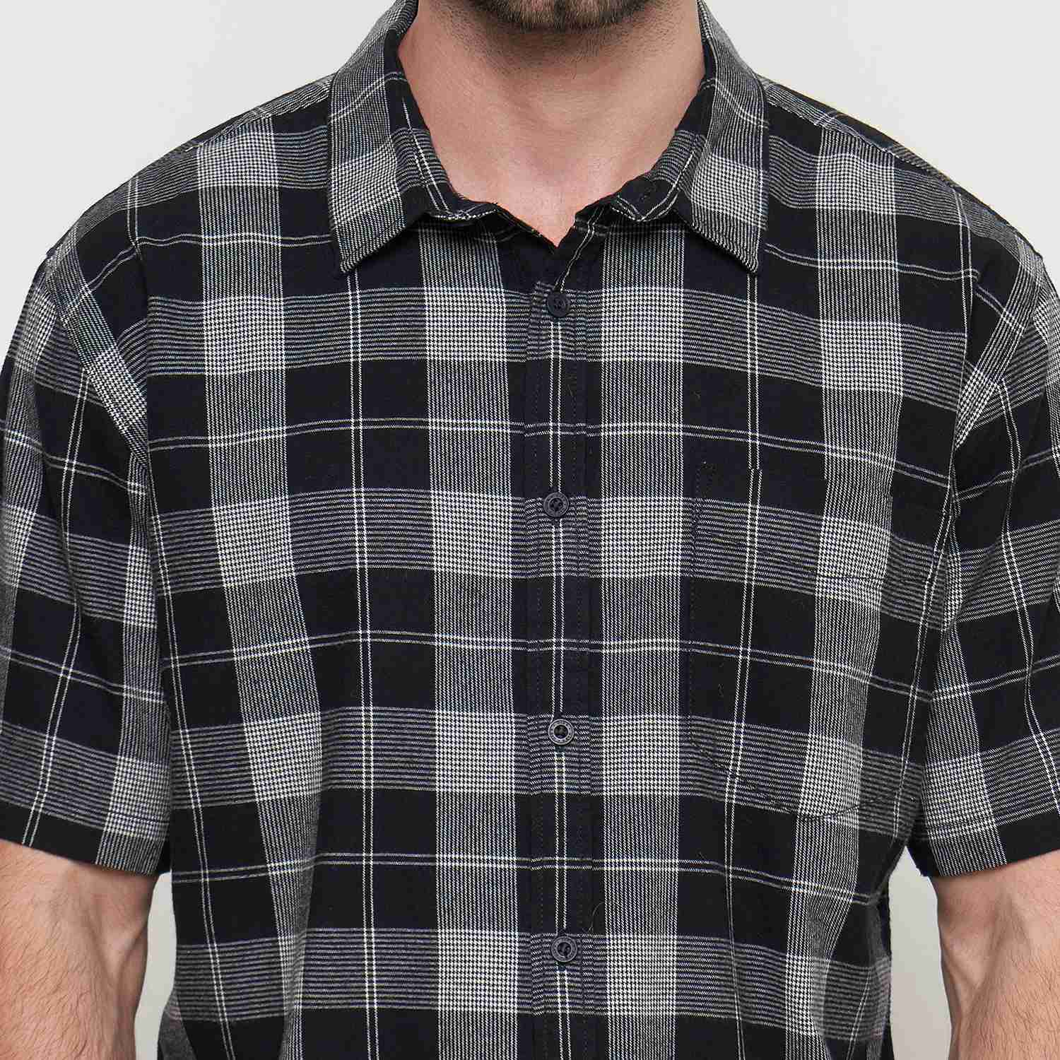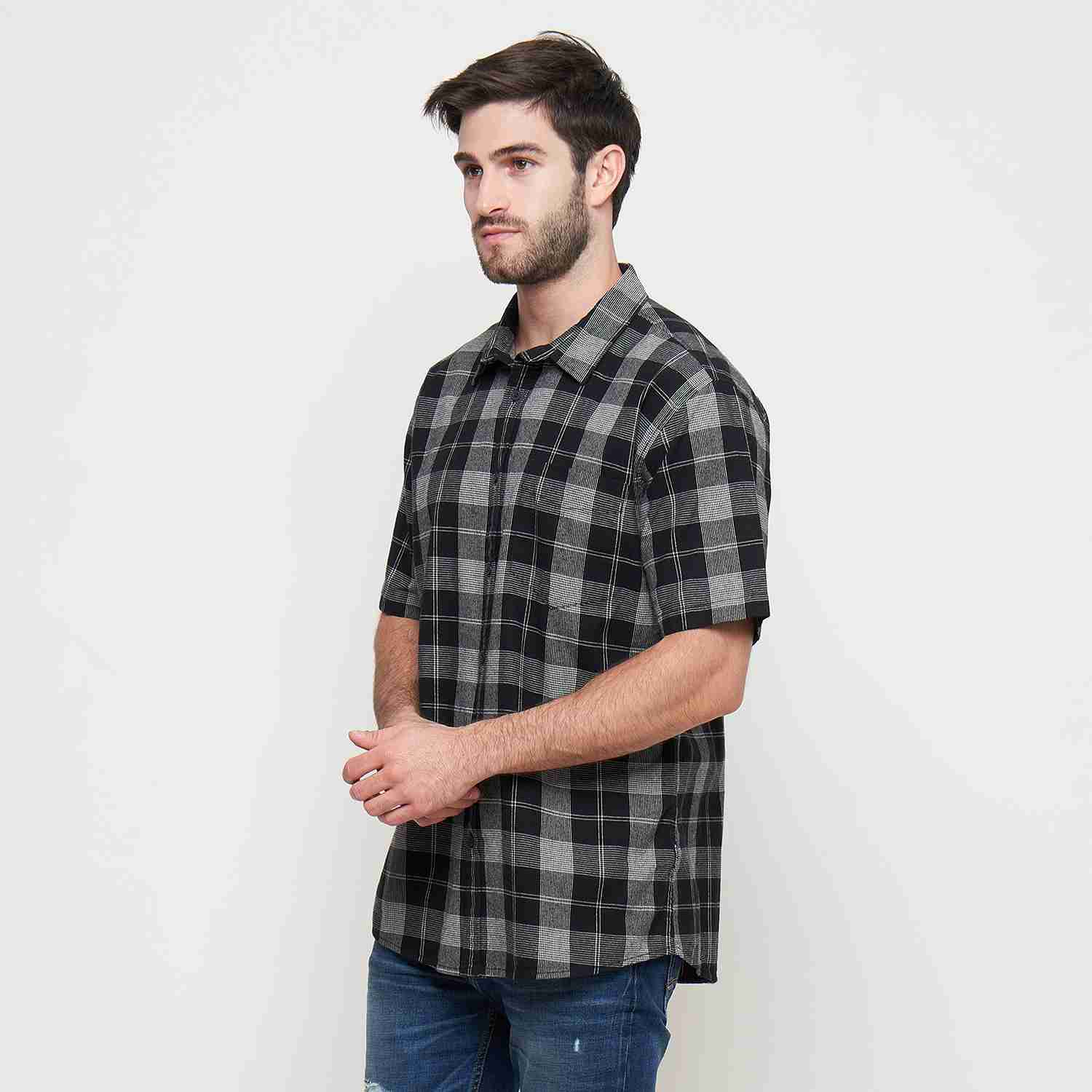 KEMEJA PRIA LENGAN PENDEK REGULAR FIT MOTIF KOTAK Bahan : 100% Cotton ; Warna : Hitam