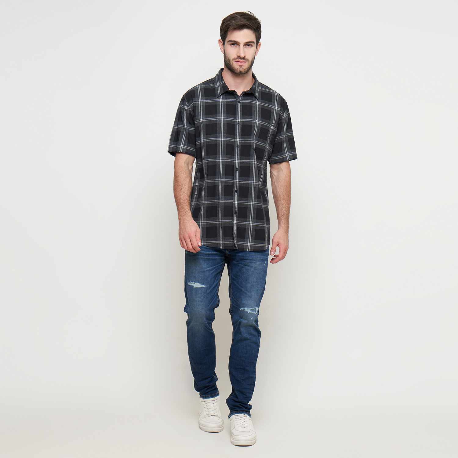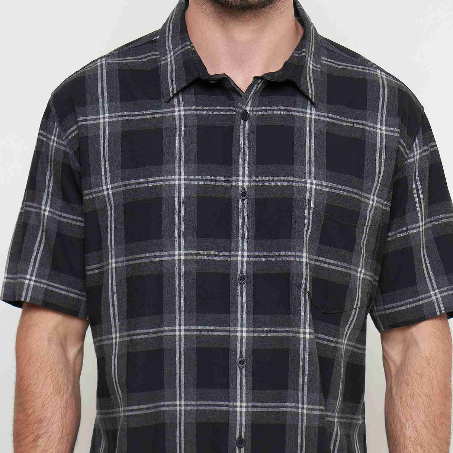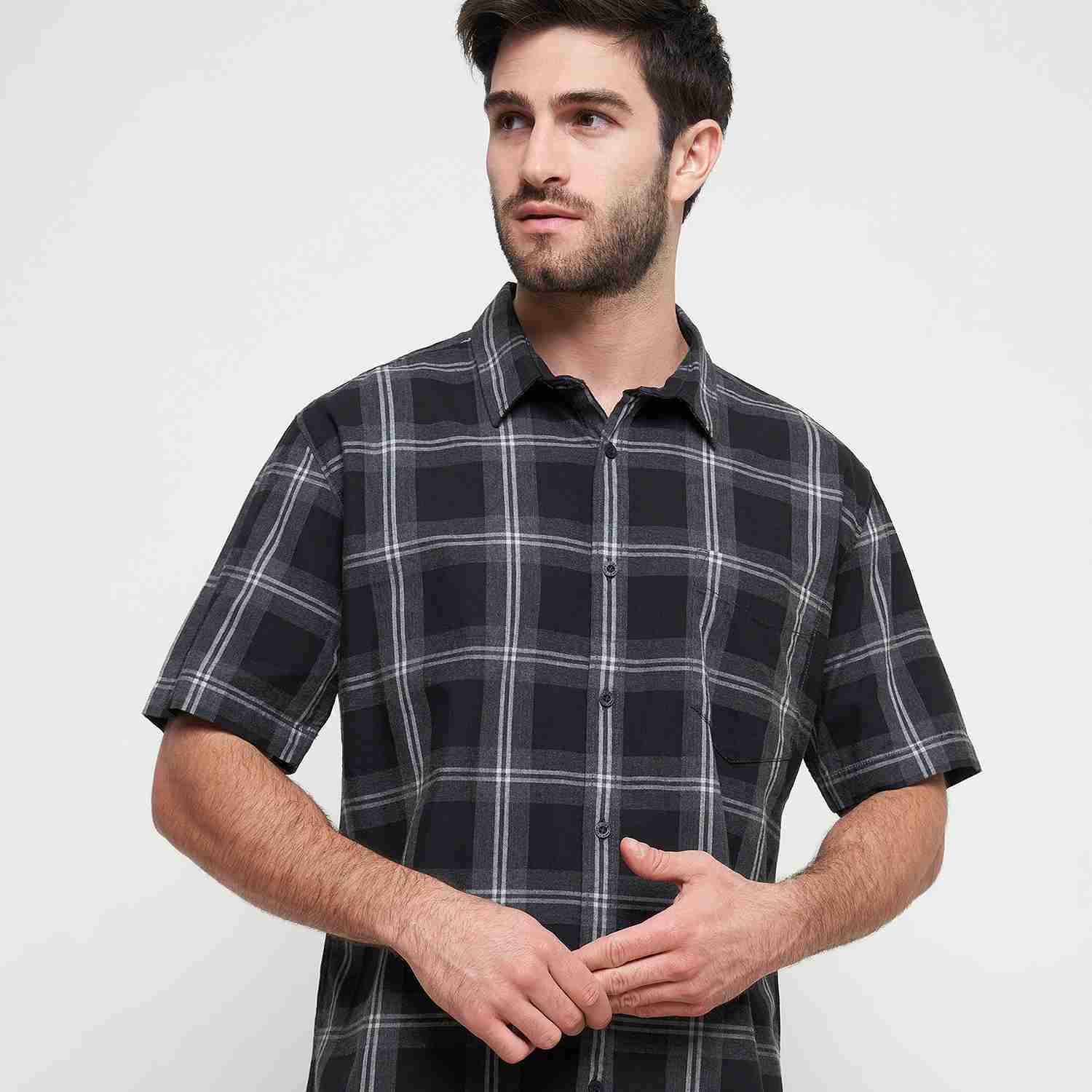 KEMEJA PRIA LENGAN PENDEK REGULAR FIT MOTIF KOTAK Warna : Abu abu gelap ; Bahan : 100% COTTON